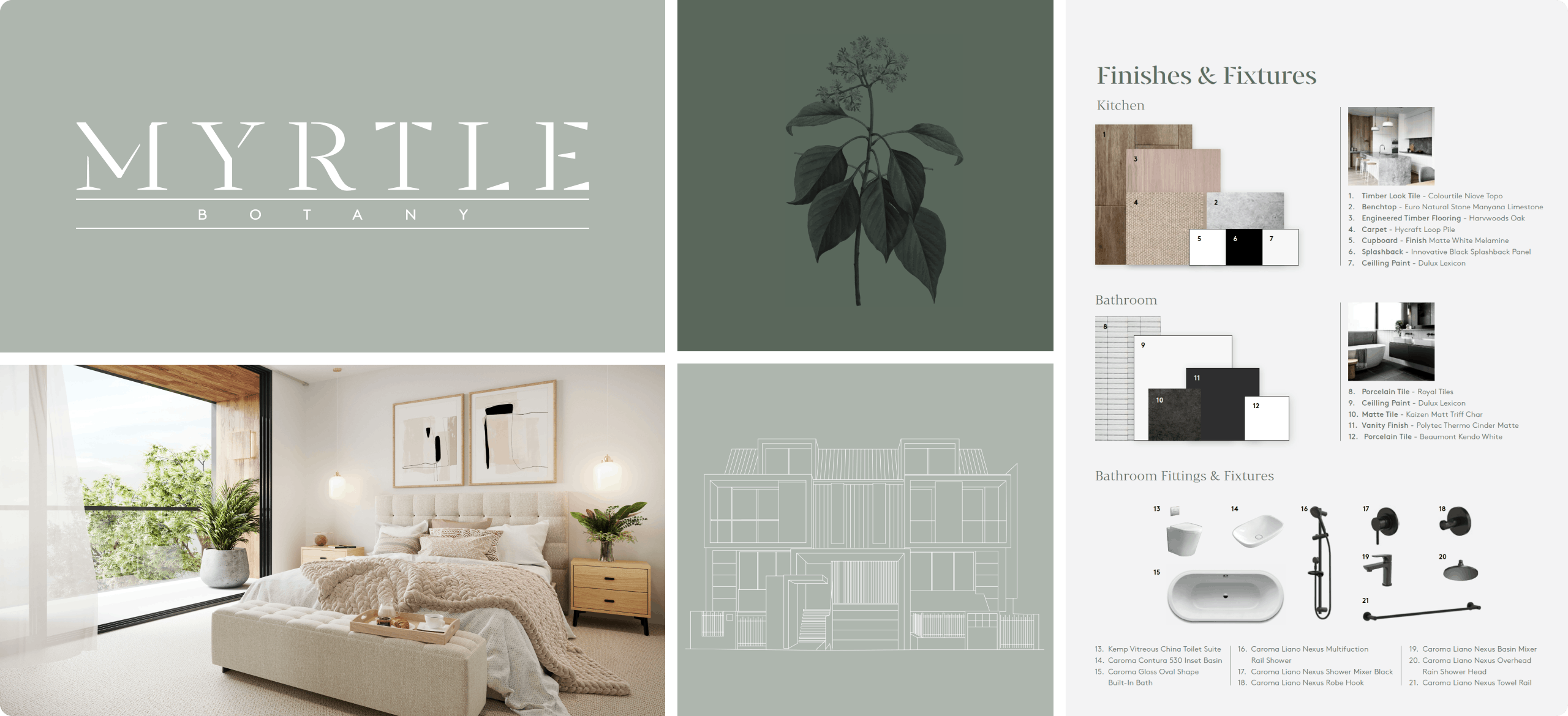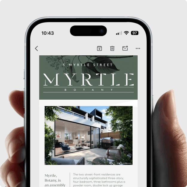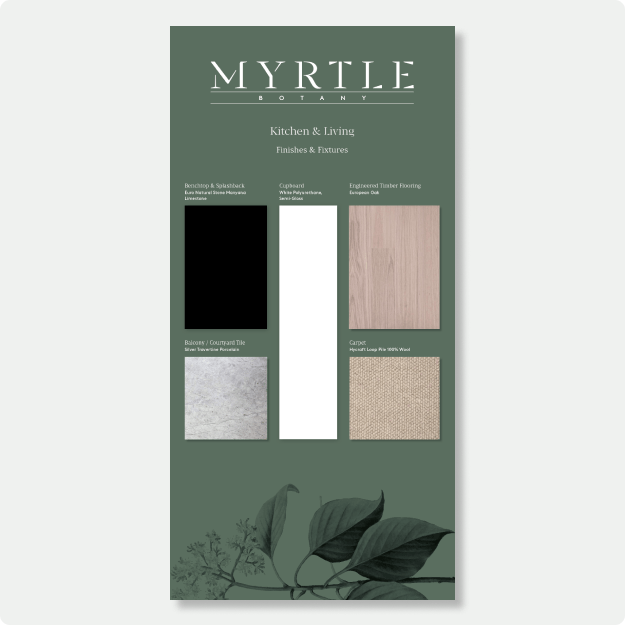 Drawing inspiration from the lush greenery that defines the suburb of Botany and paying homage to the residence's street name, the design ethos of Myrtle seamlessly incorporates soft greens and modern aesthetics. This fusion creates an organic flow that harmoniously connects the interior spaces with the natural environment outside, fostering a sense of serenity and tranquility within each apartment.